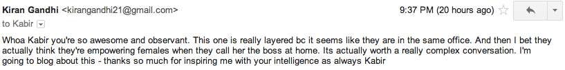 The Economist talked about many social factors affect the status of women in India. The article I read talked about how, for example, wife-beating in Bollywood films is portrayed as heroic and permissible. I have written about this often, and it is one of the very reasons I work in the entertainment industry. I believe this sentiment very much.