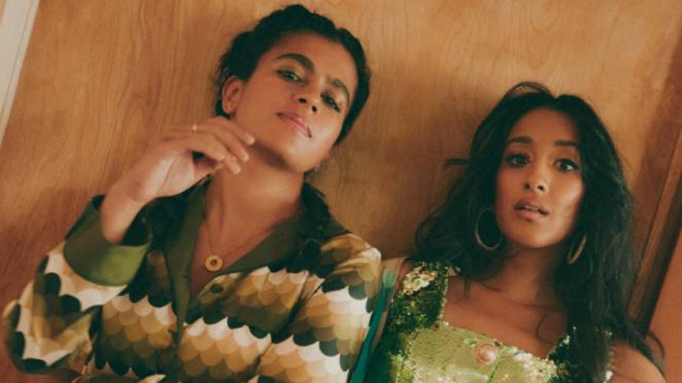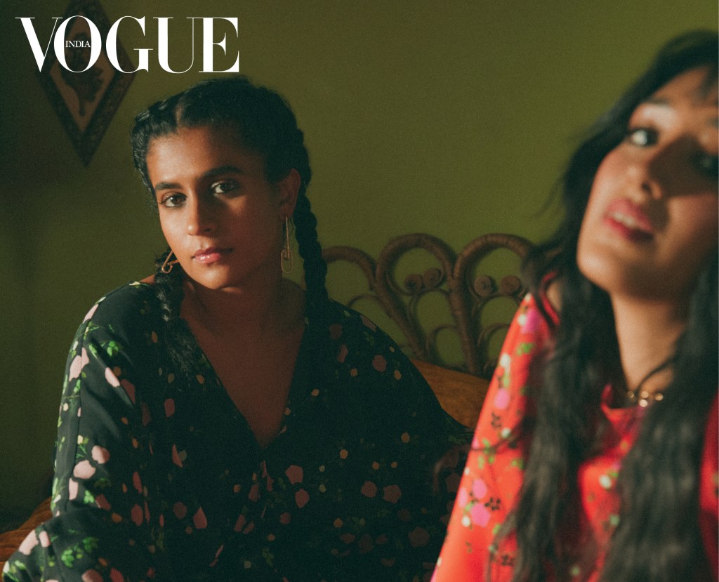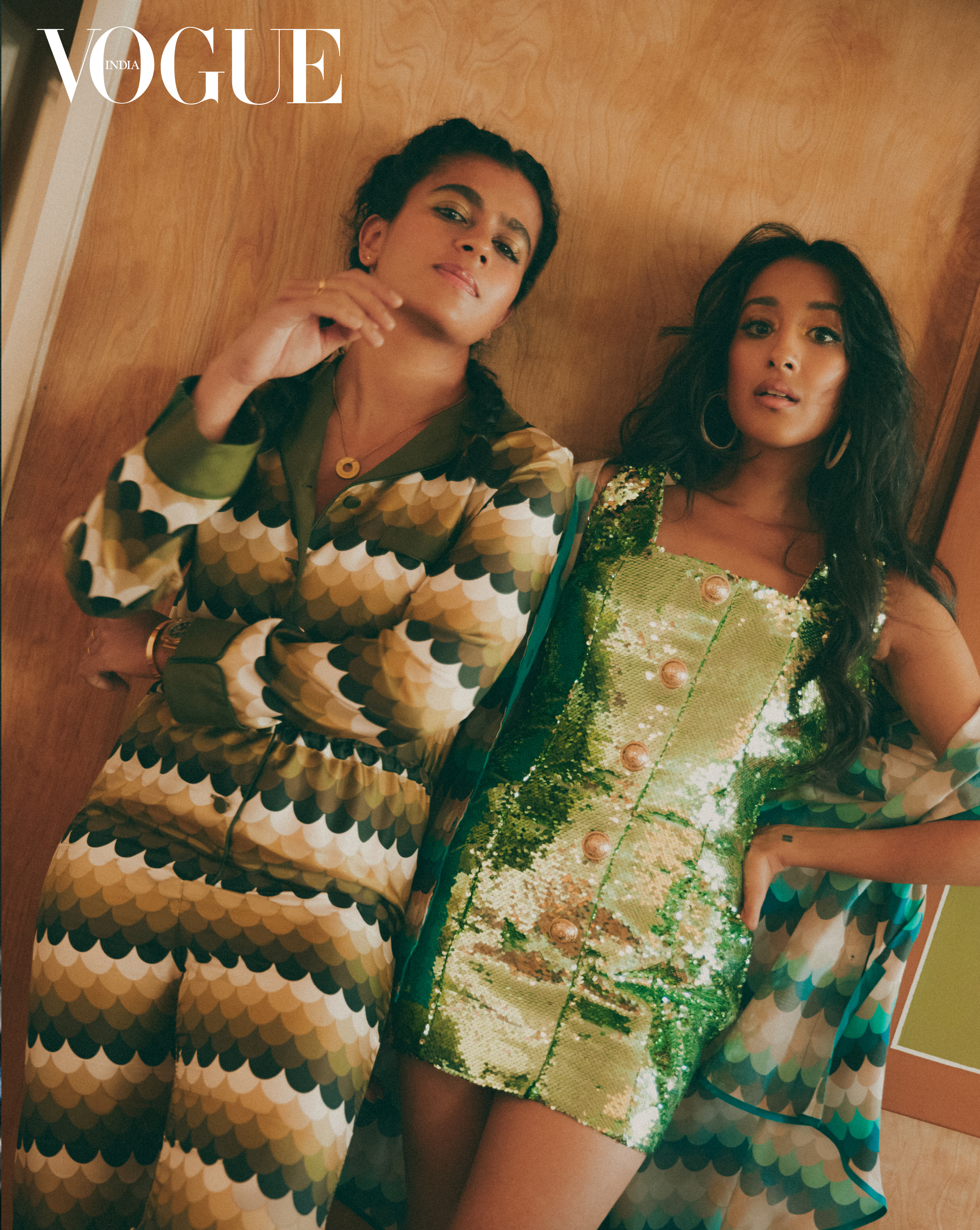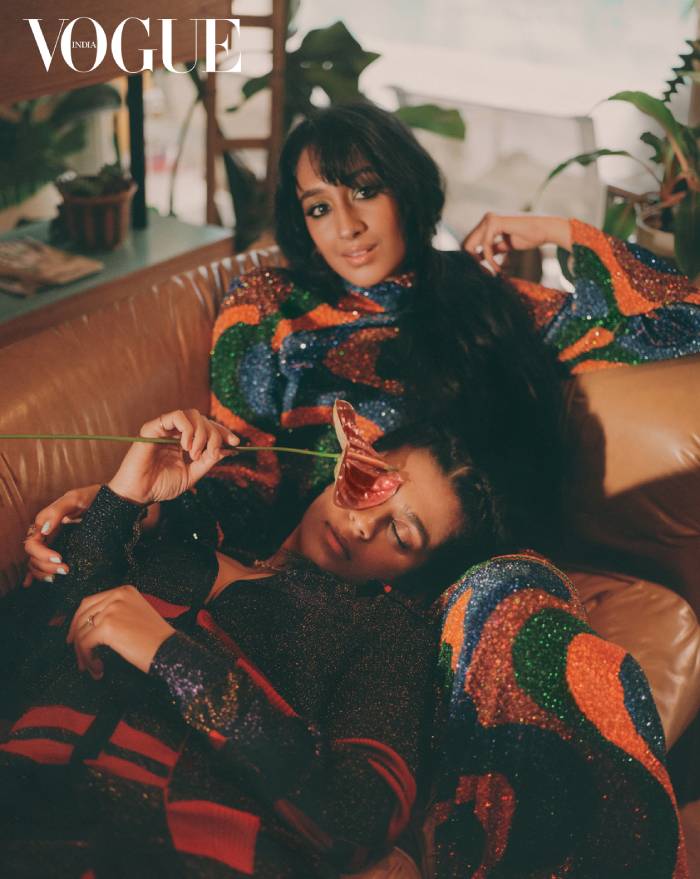 On Madame Gandhi: Jumpsuit, For Restless Sleepers. On Raveena: Sequinned dress, Balmain. Shirt, For Restless Sleepers. Earrings, Alison Lou