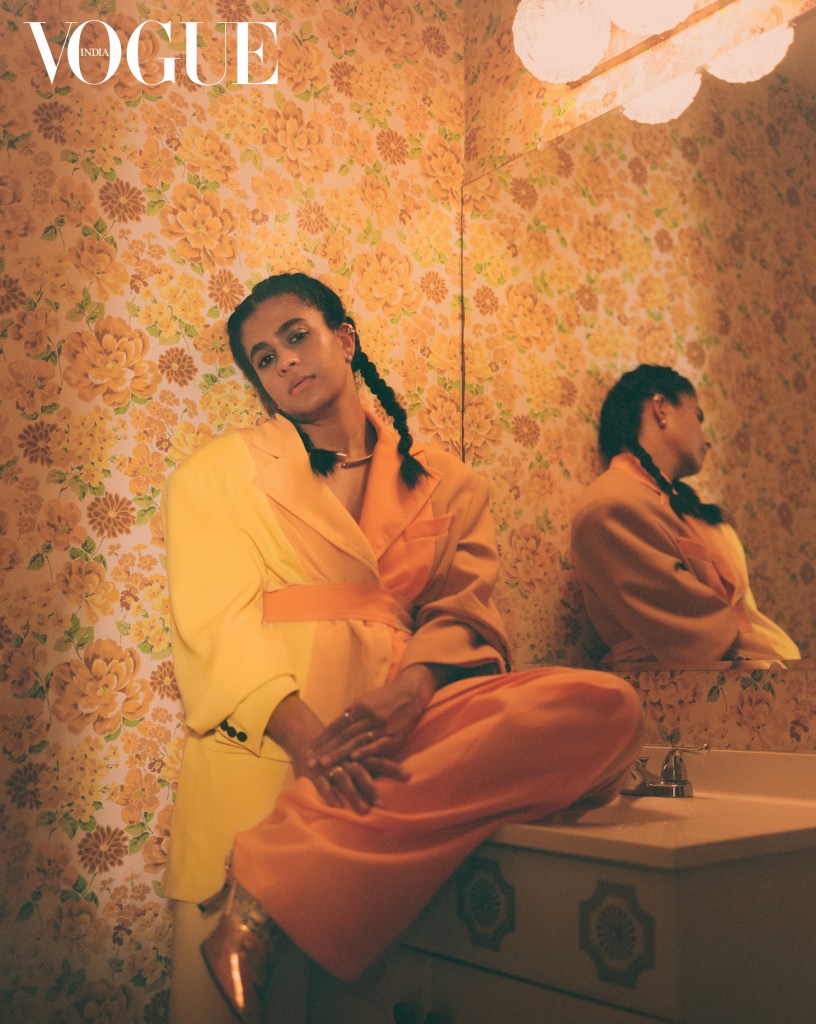 On Madame Gandhi: Blazer, trouser; both Moschino. Necklace, her own
