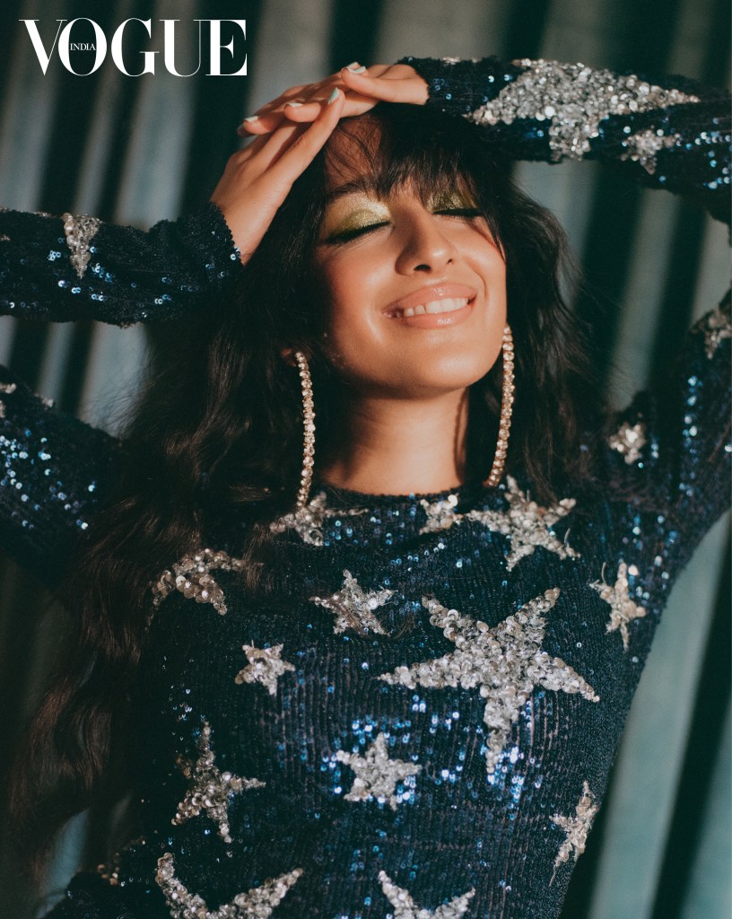 On Raveena: Sequinned top, Naeem Khan. Hoops, Area. Earrings, Fernando Jorge